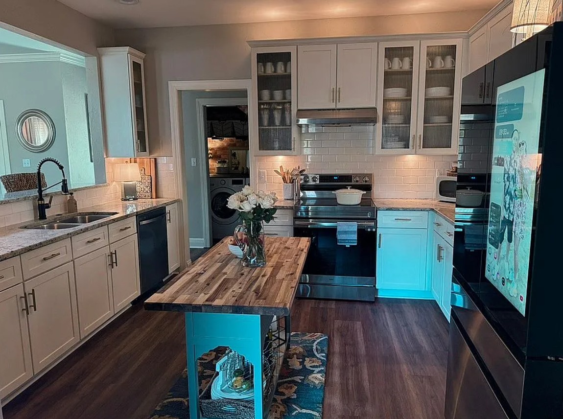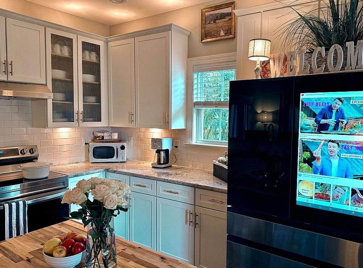The fully upgraded kitchen is designed for both everyday living and entertaining, complete with all new Samsung appliances, including a state of the art smart video refrigerator, along with ample counter space and a seamless flow into the living and dining areas.