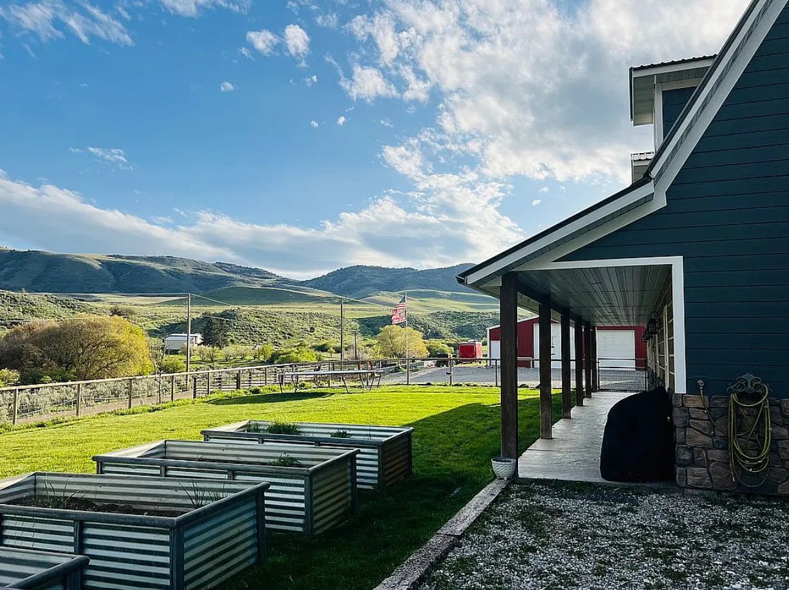 Outside, the property is designed for both work and relaxation. The 2,500 sq ft shop includes 220V power, three overhead doors, and a finished, insulated tack room. The land is ready for animals with a corral, fenced yard, chicken coop, and attached hay storage area. Enjoy outdoor living with a fire pit area, custom grow beds, and a lawn equipped with a sprinkler system, all set against beautiful valley views.