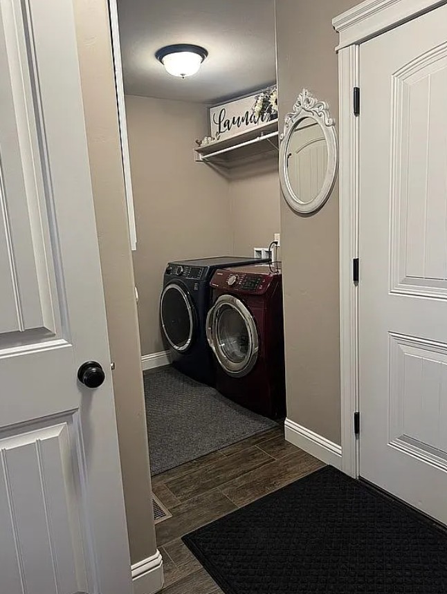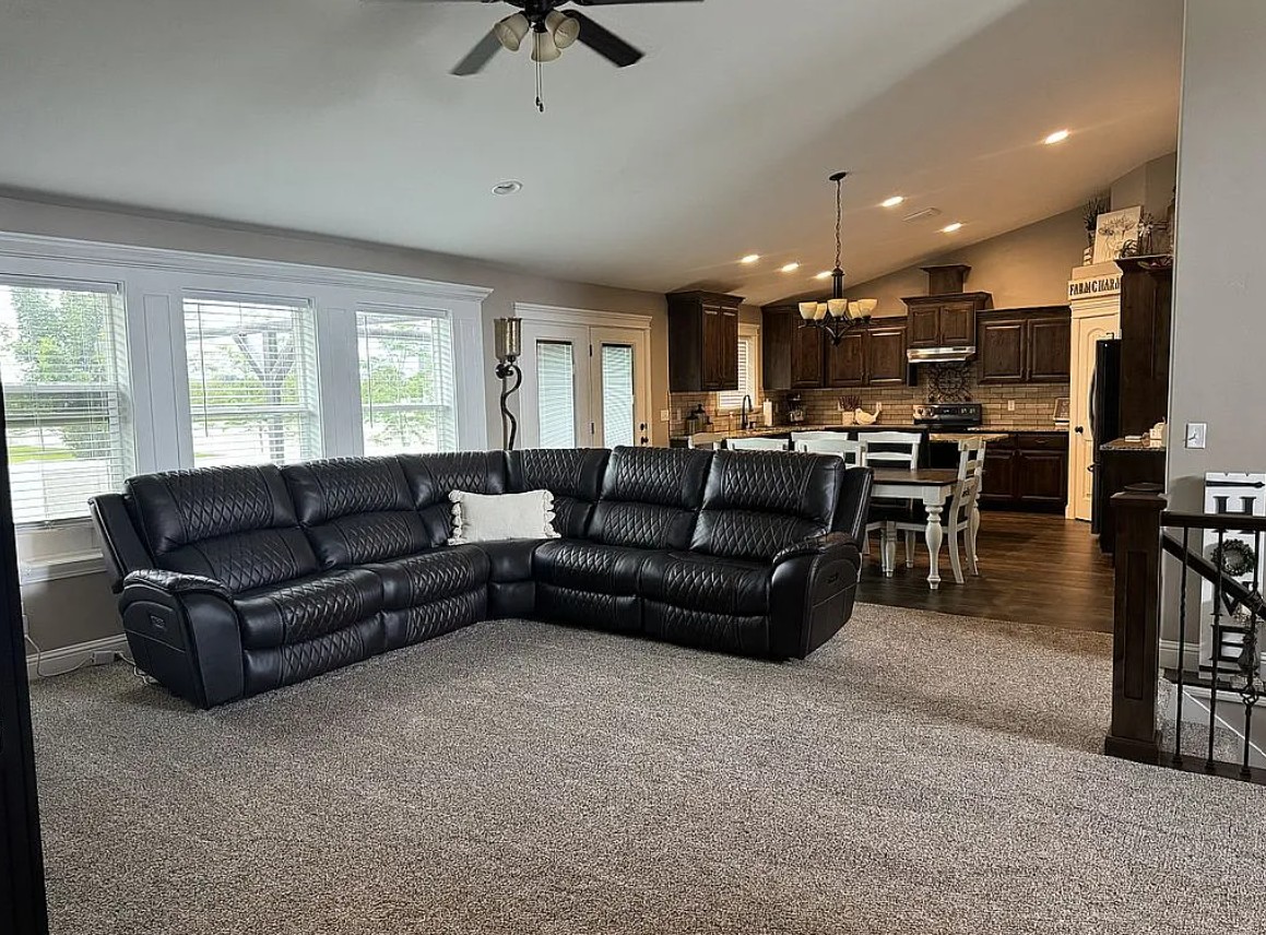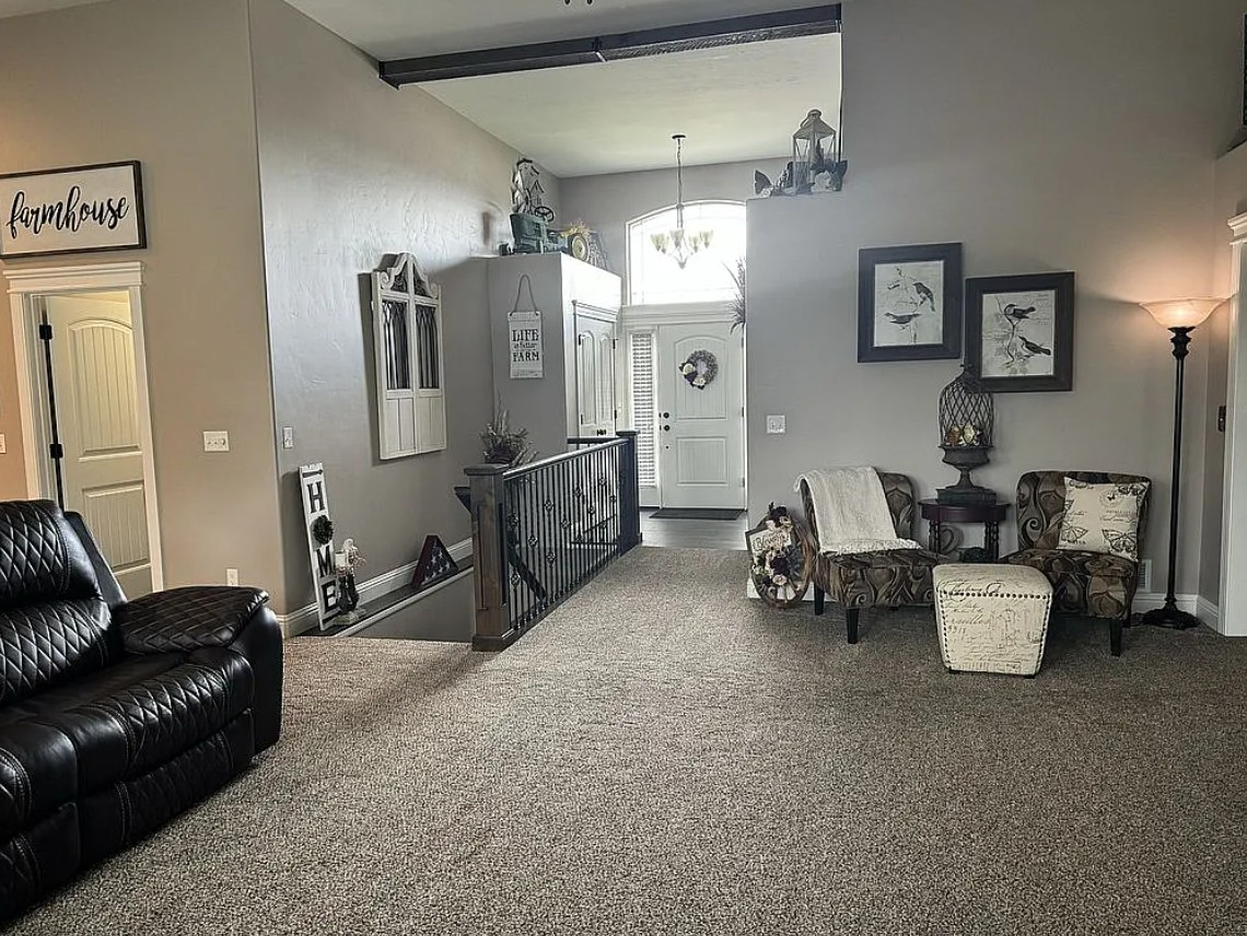 From the moment you enter, a grand entryway sets the tone for the home’s warm and inviting atmosphere. The open floor plan features high vaulted ceilings, abundant natural light from large windows (many with added privacy tinting), and elegant coordinating finishes throughout. The main level includes three bedrooms, a large laundry and mudroom, a full utility room, and an oversized walk-in pantry. The kitchen offers under-cabinet lighting and flows seamlessly into the main living space, making it ideal for both everyday living and entertaining.