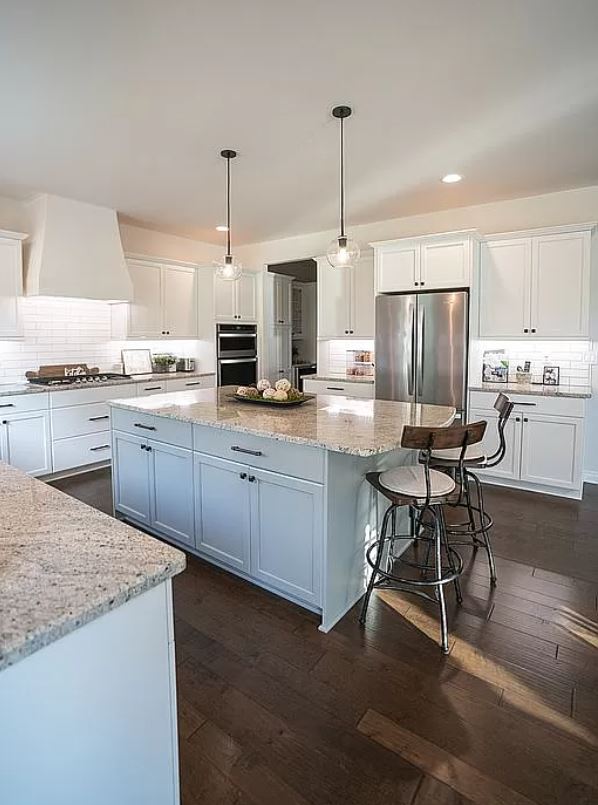 Massive granite kitchen boasts custom LaFata Cabinets, large island, tile backsplash, Stainless Steel Whirlpool Appliances and custom Hood-Vent.